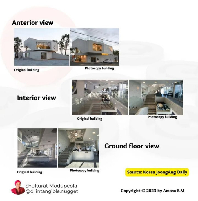 Architectural works are considered artistic works under Section 2(c) of the Nigerian Copyright Act 2022 and as such can be protected by copyright. In this case, it is clear that Kwak’s architectural work meets all the element to qualify it for copyright protection. It is an original work of Kwak; it’s a product of his efforts and skills and it was fixed in a medium.